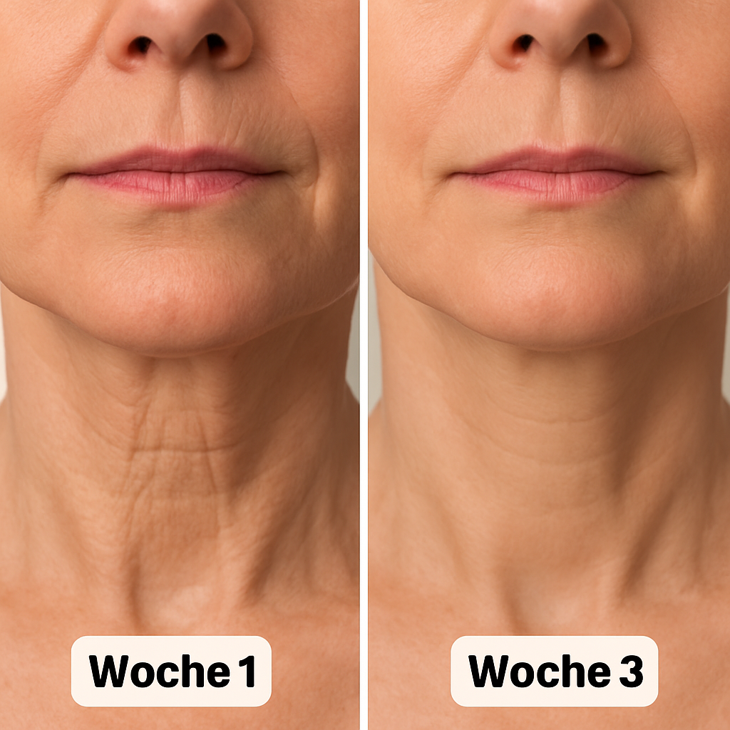 Ich bin 64. Nach 4 Wochen hat sich das Absacken verbessert und meine Kinnlinie fühlte sich straffer an. Endlich etwas, das ohne Schmerzen wirkt!